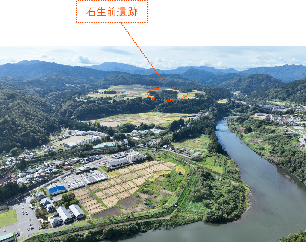 このような環境を背景に、縄文時代には石生前遺跡という大規模な集落が形成され、多量の土器が製作されました。川を通した交流により、北陸地方や関東地方など、様々な地域の文化がもたらされ、東北地方以外の特徴を持つ土器も多数出土しています。石生前遺跡は、当時の広範囲な交流を今に伝える文化の交差点ともいうべき遺跡です。